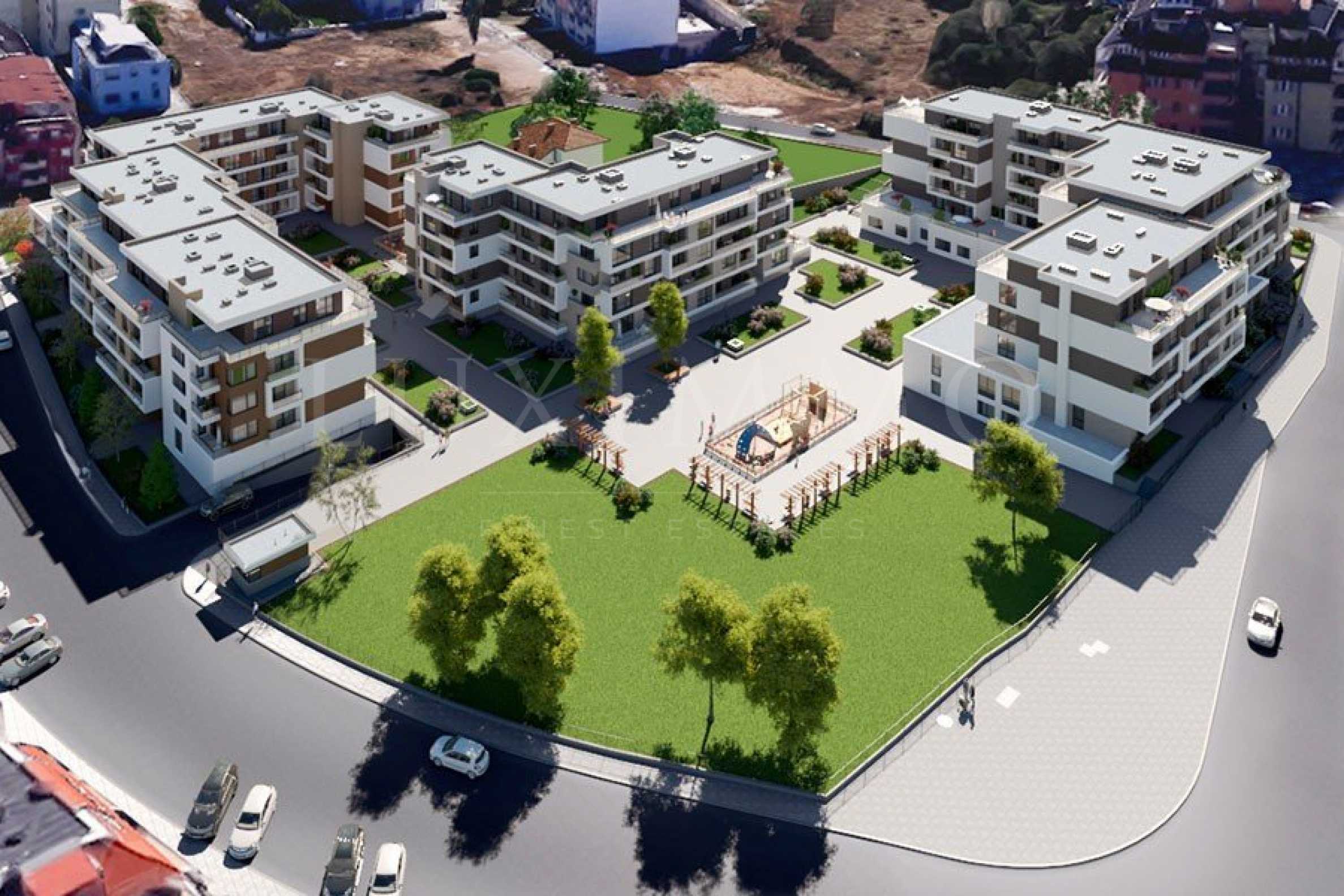 Комплексът е заобиколен от зеленина. Доброто планиране на сградите дава простор и гледка, както и много светлина в апартаментите.