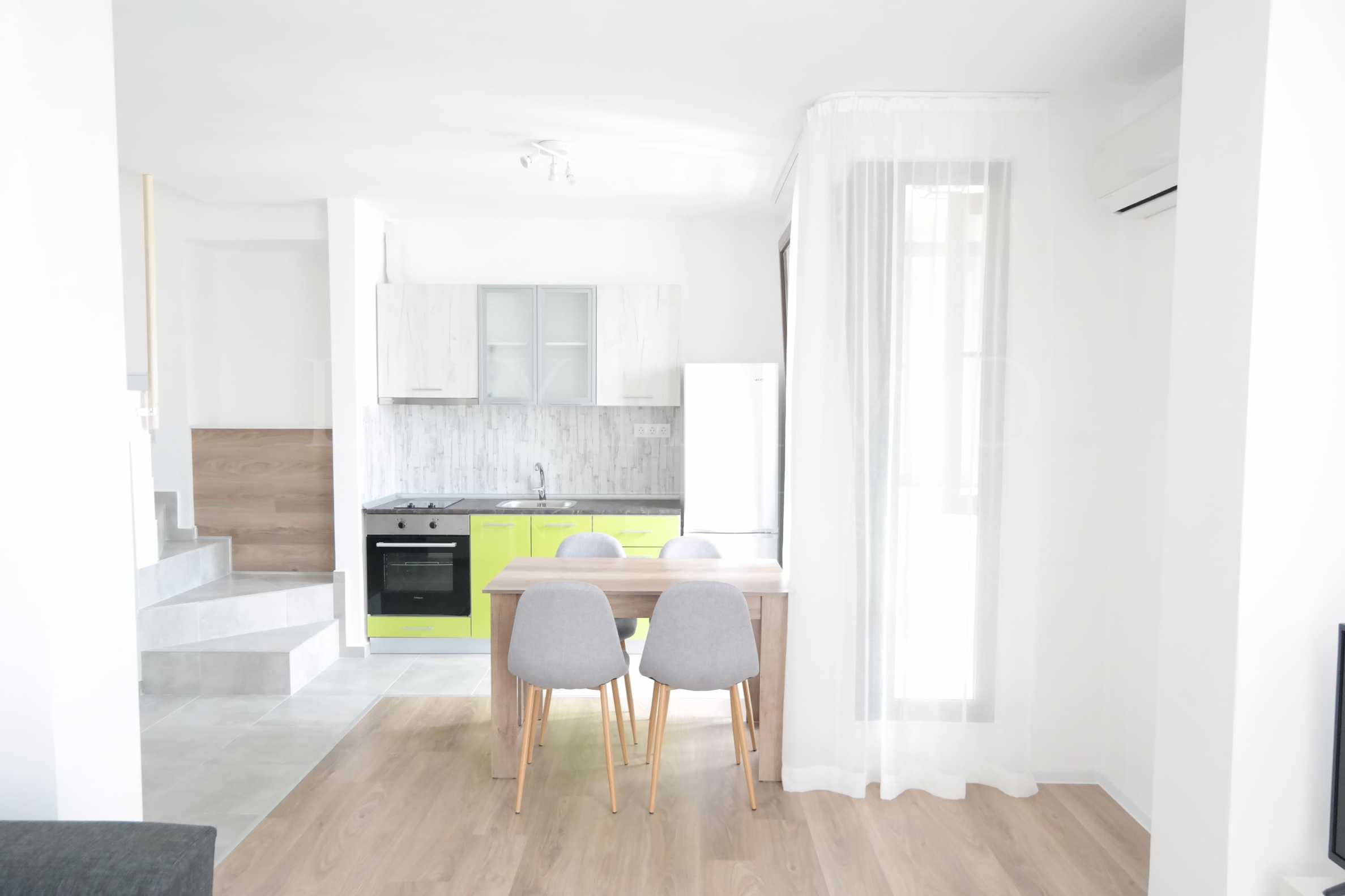 Разпределение: Хол с трапезария и кухненски бокс. На второто ниво са разположени една спалня, отделна стая с две легла и гардероб и баня с тоалетна;