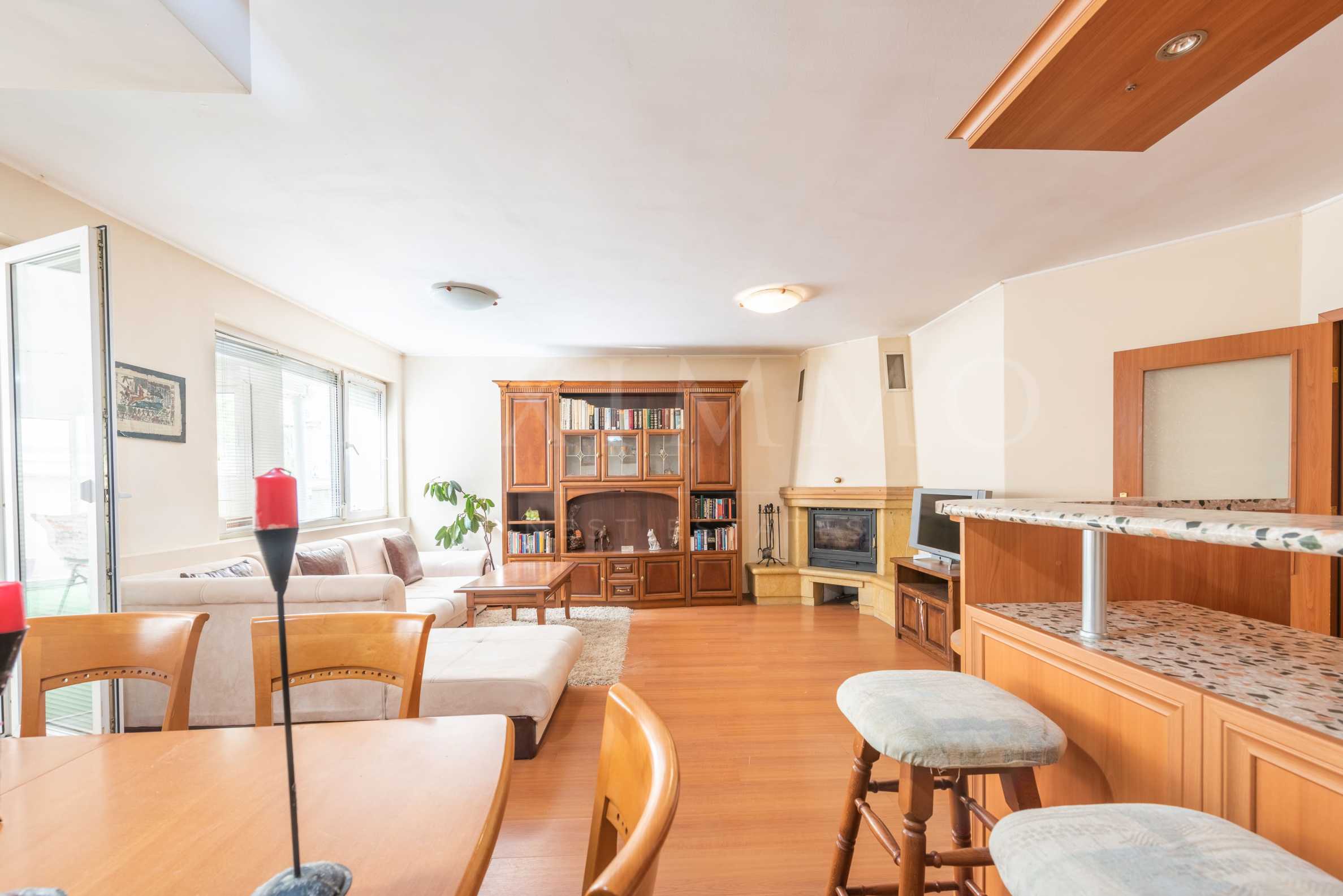 Апартаментът, който предлагаме се намира в нова сграда на 1 етаж и е с площ от 70 кв.м плюс 40 кв.м зимна тераса. Състои се от просторна дневна с камина, трапезария с кухненски бокс, от дневната се излиза към зимната градина. Тя има достъп до външна тераса. Жилището е с една спалня, има обособена стая за гардеробна. Напълно оборудвана баня с тоалетна и монтирана душ-кабина, отделно перално помещение и просторно антре. Инсталирани са климатици.