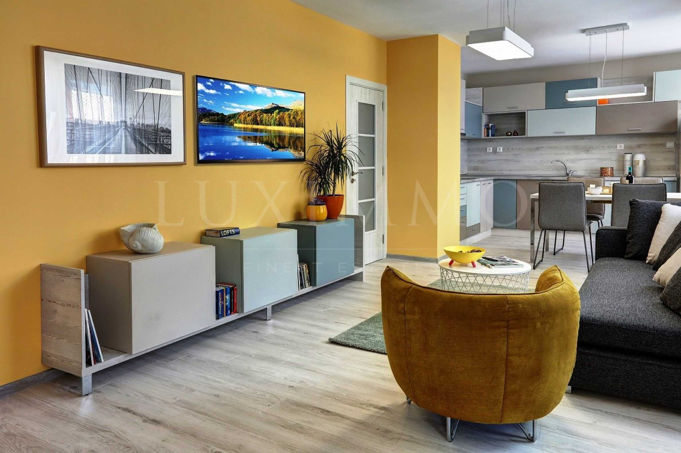Апартаментът с югозападно изложение се намира на 4 етаж в нова сграда с асансьор и луксозни общи части. На чиста жилищна площ от 124 кв.м. са разположени: напълно обзаведена дневна с кухненски бокс и излаз на тераса с гледка към вътрешен двор, две спални, два напълно завършено и оборудвани санитарни възела, две просторни антрета, общо две тераси и складово помещение.