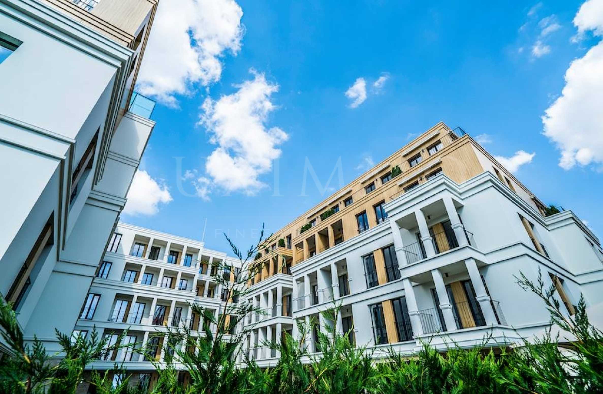 Всички прозорци в апартамента гледат към зелена паркова зона. Има малка тераса, към която от двете стаи водят високи стъклени врати тип френски прозорци.