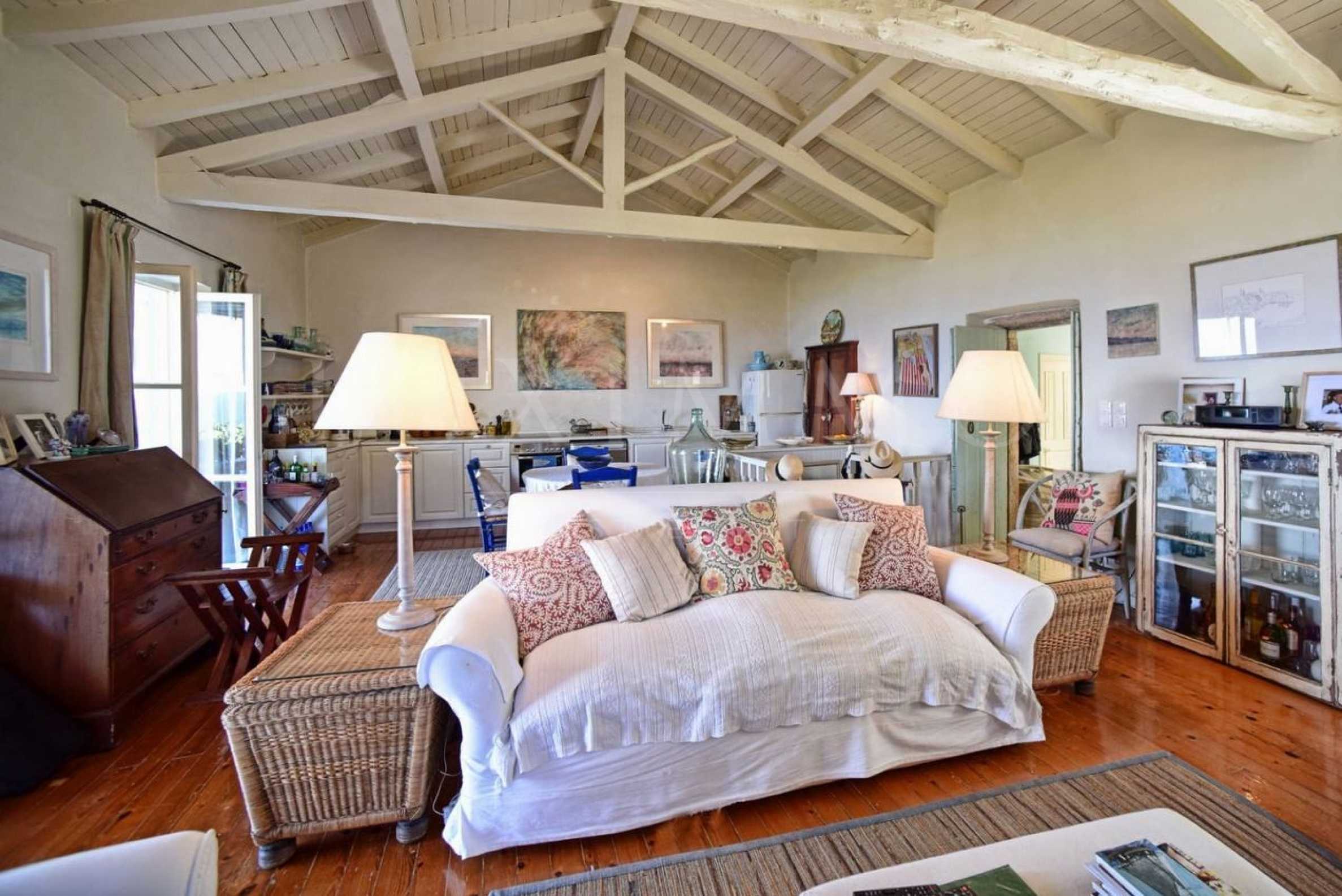 Основната къща разполага с павиран паркинг. Главният вход се отваря към просторен коридор, който води до прекрасна просторна дневна/трапезария с дървени греди и балконни врати, водещи към балкона с невероятна гледка. Тази зона разполага и с напълно оборудван отворен план кухня, позволявайки светлината да осветява целодневно имота.
