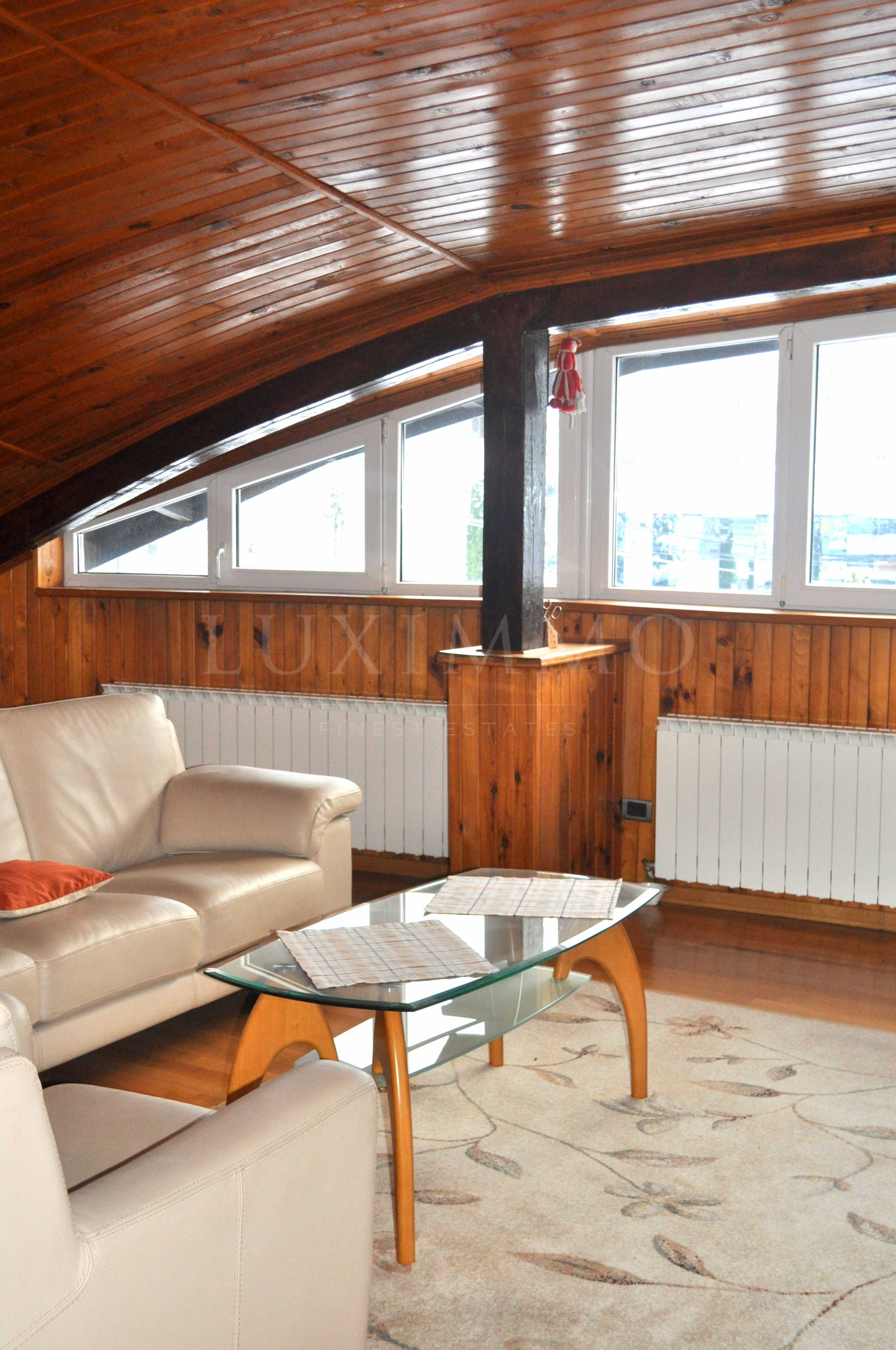 Напълно обзаведено с мебели подови настилки от естествени материали. Стените и таваните са почти изцяло облицовани в дърво.