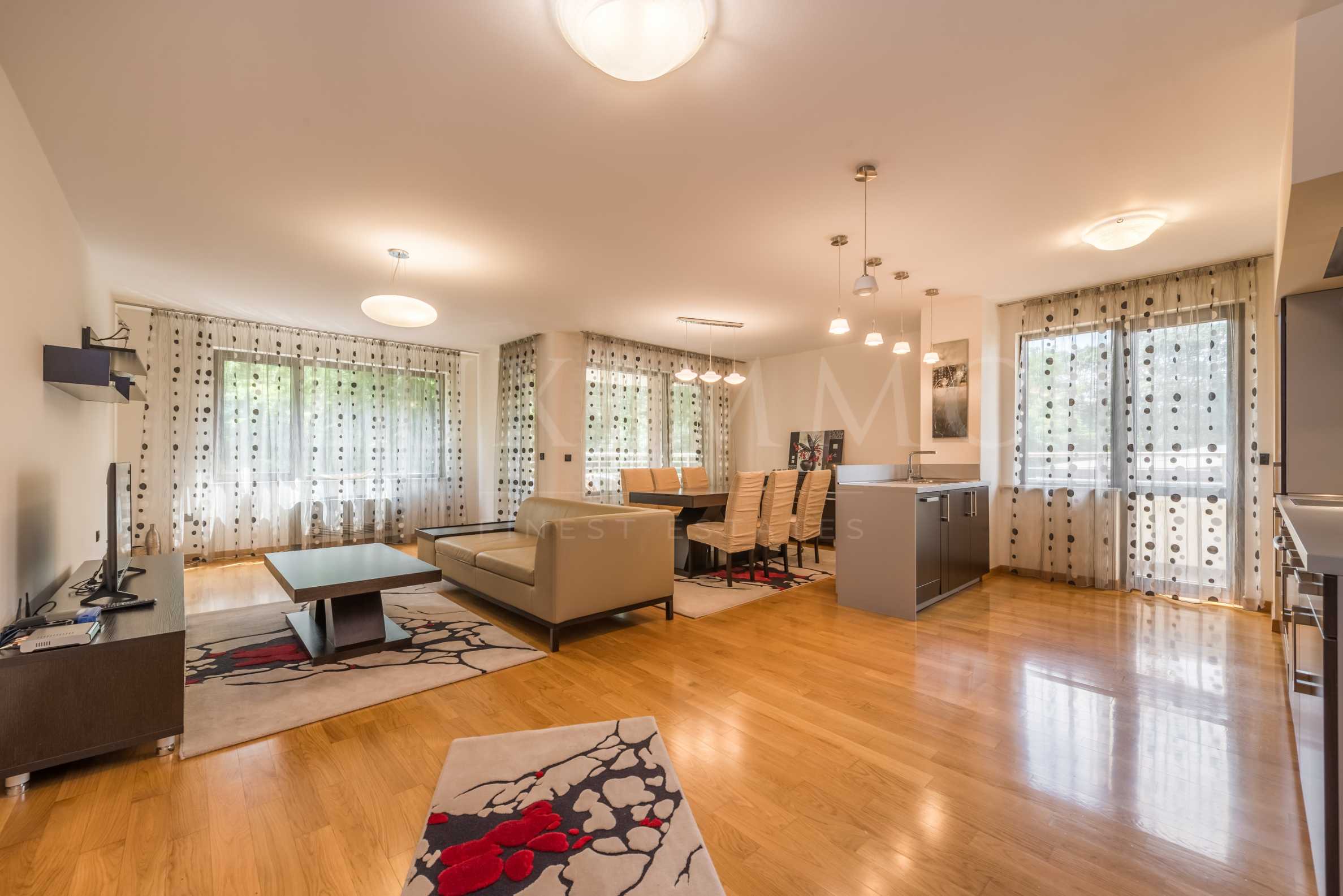 Апартаментът се състои от просторна дневна, трапезария и кухня, две спални, една баня, мокро помещение, тоалетна за гости и три тераси.