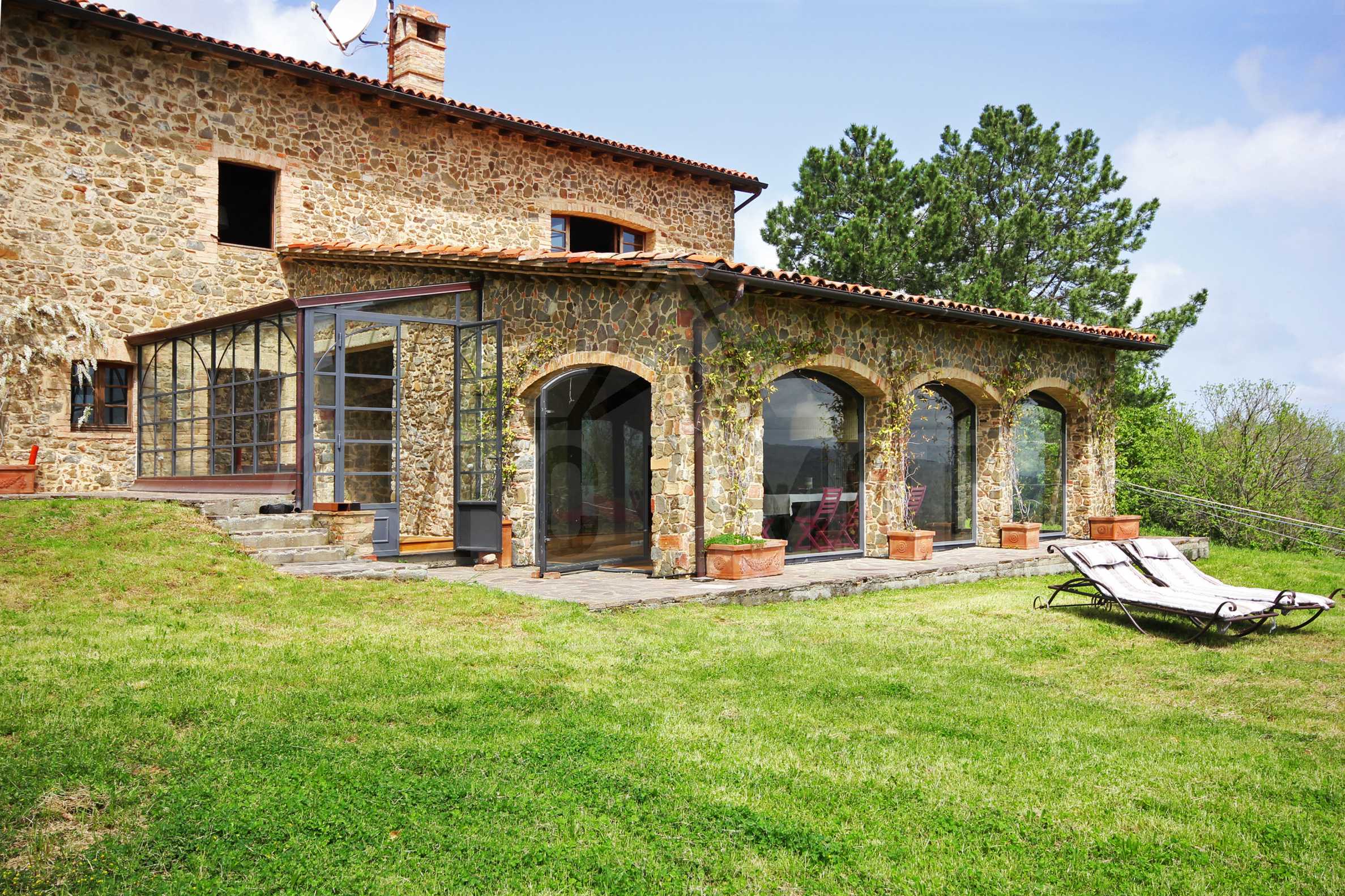 На върха на хълм с прекрасна панорамна гледка към долината Монте Амиата, тази красива и луксозна каменна къща е в очакване на новите си собственици. Имението е изцяло реновирано, с внимание към традиционните елементи с цел запазване на красива и забележителна архитектура. Каменната сграда е със старинни плочки и с настилки от теракот.