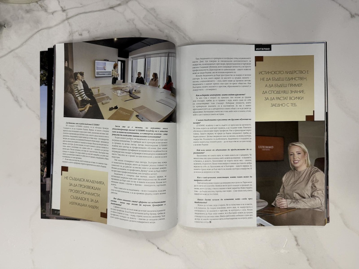 В един момент разбрах, че Академията не може да остане само вътрешна инициатива. Тя трябваше да се превърне в инструмент за промяна на целия сектор. Затова лицензирахме LUXIMMO Academy като център за професионално обучение. Днес имаме правото да издаваме сертификати за упражняване на дейността и да изграждаме нов стандарт за брокери и мениджъри в недвижимите имоти. Това вече не е проект за една компания, а мисия за цяла индустрия.