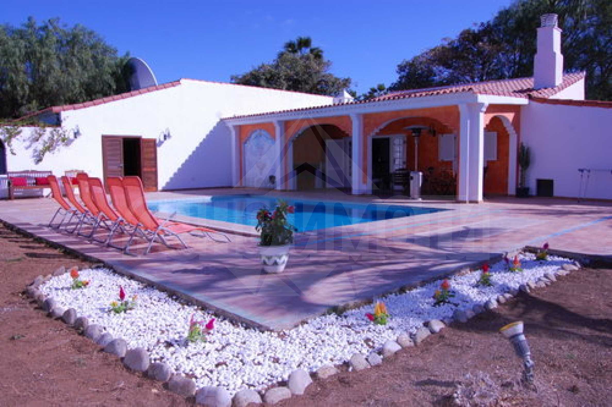 Луксозният имот предлага и огромна градина, топъл басейн, зона за барбекю, сауна.