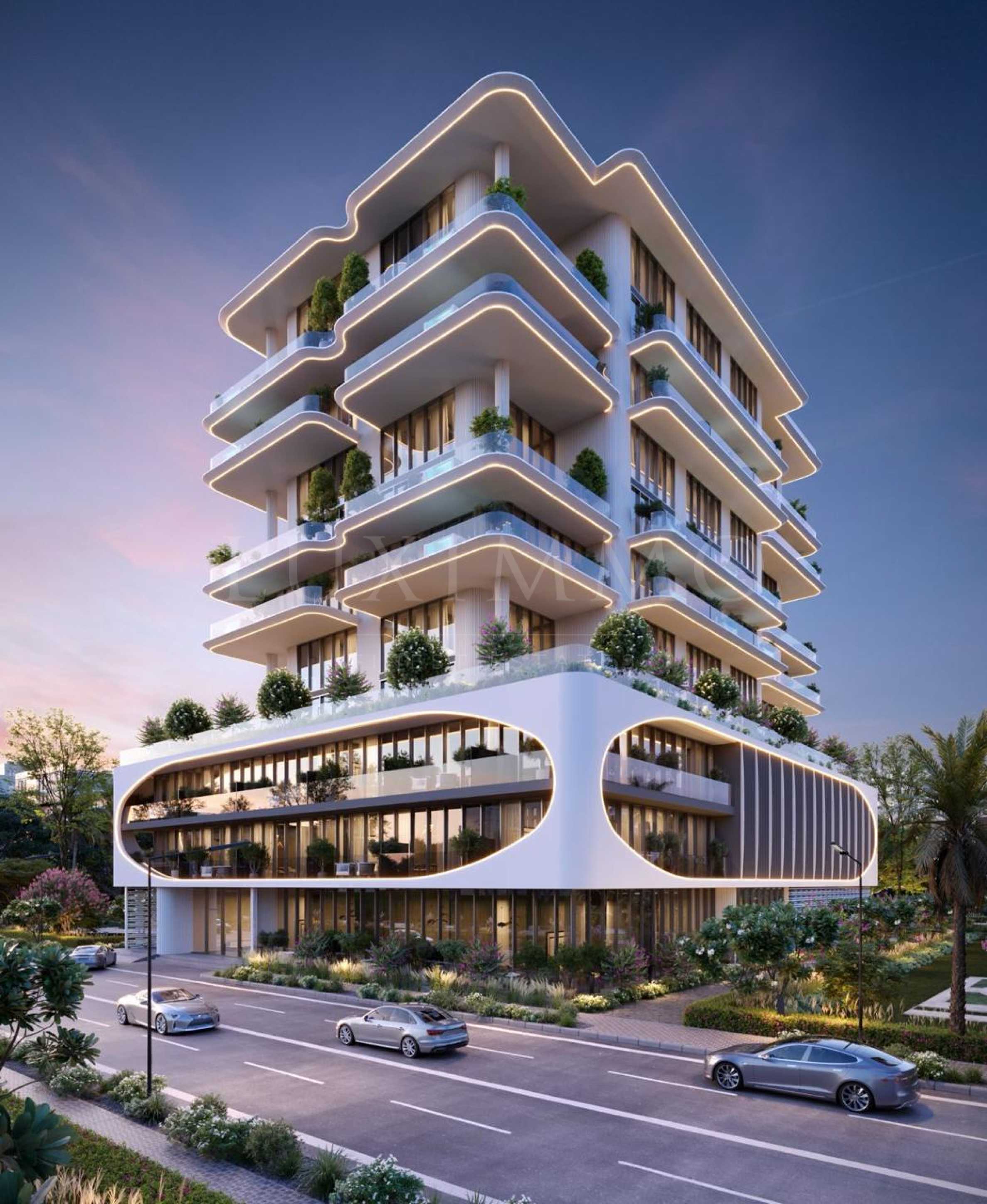 Villa Dell'Arte впечатлява от пръв поглед със своята елегантна архитектура – изящни извивки, прецизно проектирано осветление и овални подиумни етажи, които ѝ придават уникален силует. Високите тавани и прозорците от пода до тавана не само обогатяват визията, но и осигуряват усещане за простор и светлина. Сградата се издига на 11 етажа, а на покривната ѝ тераса Ви очаква стилна зона с барбекю и пространство за хранене на открито – идеално място за незабравими вечери със семейство и приятели на фона на морските гледки. Допълнителни удобства като модерна фитнес зала и специално обособена детска зона превръщат Villa Dell'Arte в перфектно място за активен и балансиран начин на живот.