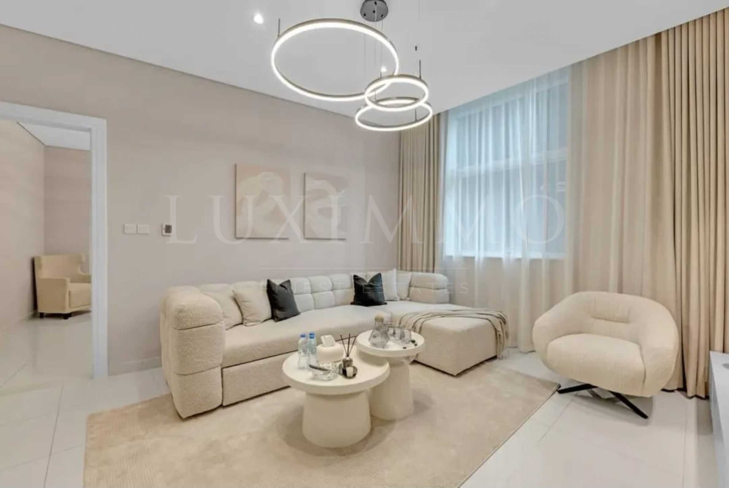 Представяме светъл и просторен двустаен апартамент, намиращ се в луксозната Damac Maison Cour Jardin в Downtown, Дубай. Жилището се предлага напълно обзаведено и оборудвано, като в интериора е заложено на светли цветове и изчистени линии, а високия клас кухня и електроуреди допълват цялостното луксозно изживяване.