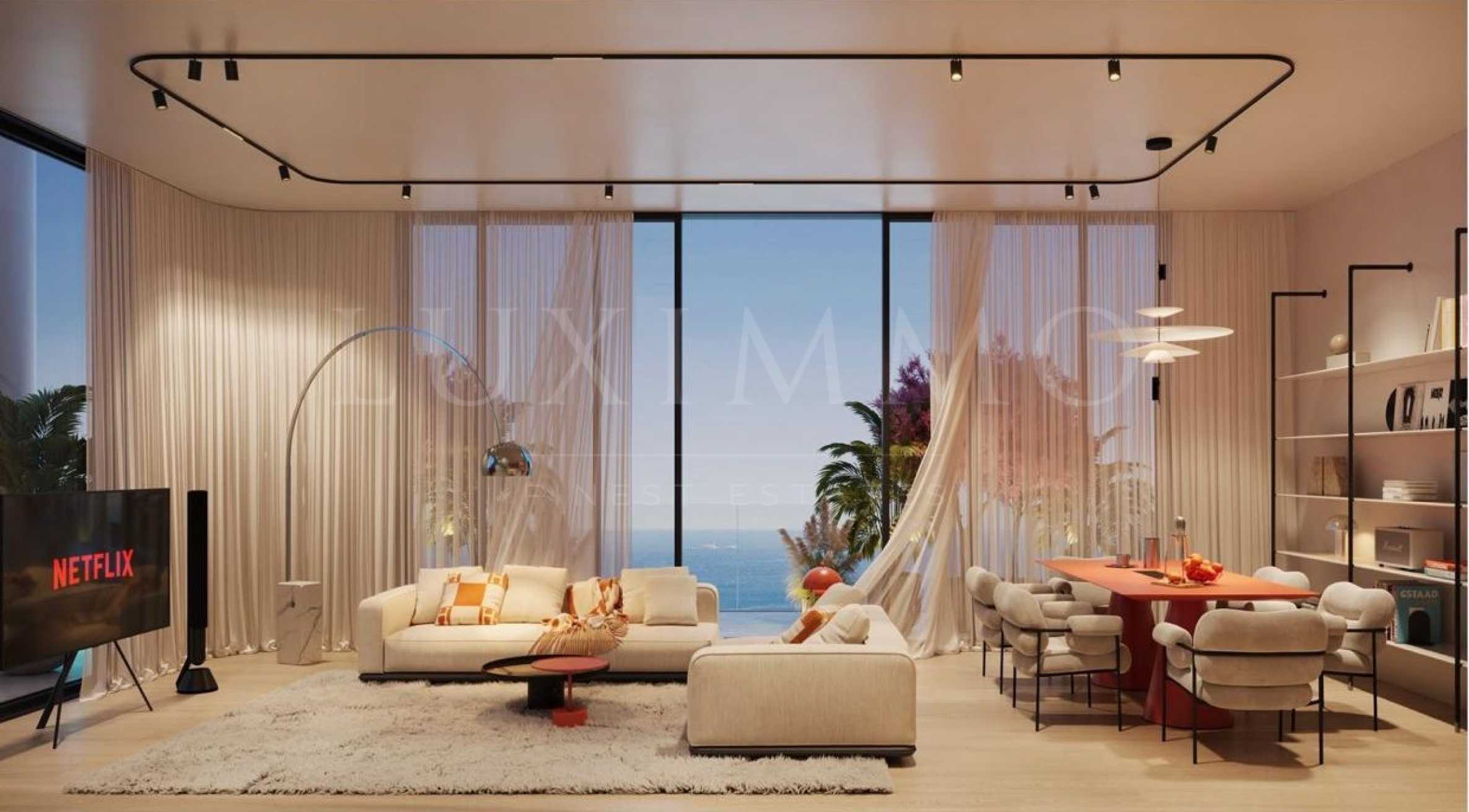 Villa Dell’Arte е истинско произведение на архитектурното изкуство – елегантна фасада с плавни линии, хармонични извивки и внимателно подбрано осветление, което подчертава уникалния ѝ силует. Сградата е с високи тавани и панорамни прозорци от пода до тавана, които осигуряват естествена светлина и простор.