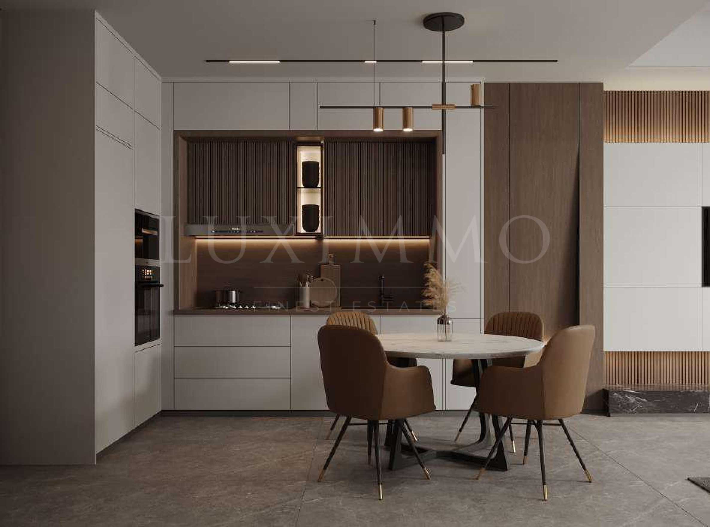 Апартаментът се предлага напълно обзаведен и оборудван, готов да посрещне новите си собственици. Всеки детайл носи усещане за качество и стил – електроуреди Bosch, санитария Roca и изискана кухня с италиански дизайн, която впечатлява с естетика и издръжливост.